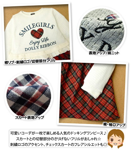 刺繍ロゴのアクセント、チェックスカートのフレアシルエットも◎特長・Dolly ribbon(ドーリーリボン)・長袖ドッキングワンピース・重ね着風/フェイクレイヤード・長袖Tシャツ×スカート・綿ニット ・切替部分チェック ・刺繍ロゴ ・チェックスカート ・フレア ・子供用 ・女の子素材[アイボリー]・(上身頃生地)綿100%・(リブ部分)綿95% ポリウレタン5%・(スカート部分)ポリエステル48% 綿45% レーヨン7%[グレー]・(上身頃生地)綿100%・(リブ部分)綿95% ポリウレタン5%・(スカート部分)ポリエステル66% 綿27% レーヨン7%サイズ【110cm】着丈56cm/身幅33cm/肩幅26cm/袖丈40cm【120cm】着丈60cm/身幅34cm/肩幅26cm/袖丈43cm【130cm】着丈70cm/身幅35cm/肩幅26cm/袖丈47cm商品を実際に採寸した平均値です。